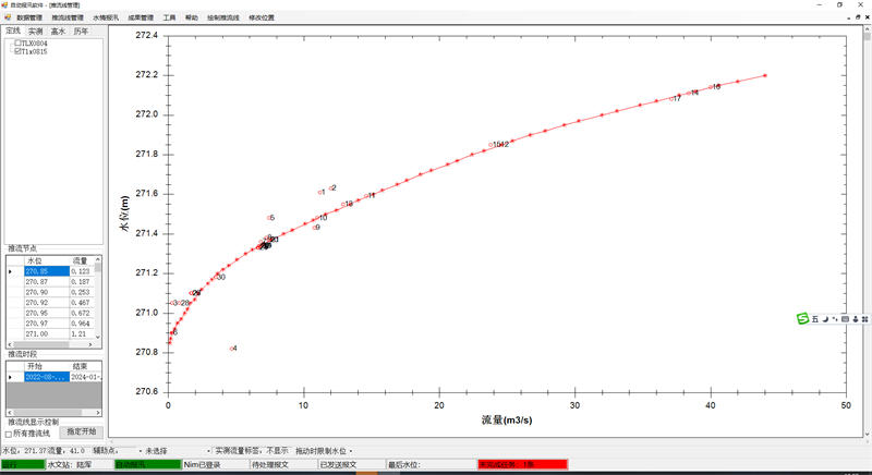 关键技术:一是推流线的自动拟合、交互操作,既可根据实测流量自动拟合推流曲线,也可通过屏幕选点进行推流曲线绘制,同时可对推流线节点进行拖曳、修改、删除等交互操作;二是自动报汛,通过预设水情报汛任务,根据所读取的自记水位变化过程,实现自动报汛。
